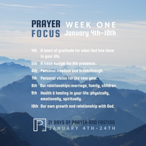 In accordance with our 21 Day Fast, we will be having Pursuit Nights, 1 hour of corporate prayer & worship, in January on Thursdays, the 8th, 15th & 22nd at 6:30 PM. Below you will find some details to help guide you and answer any questions you may have throughout this 21 day fast.
